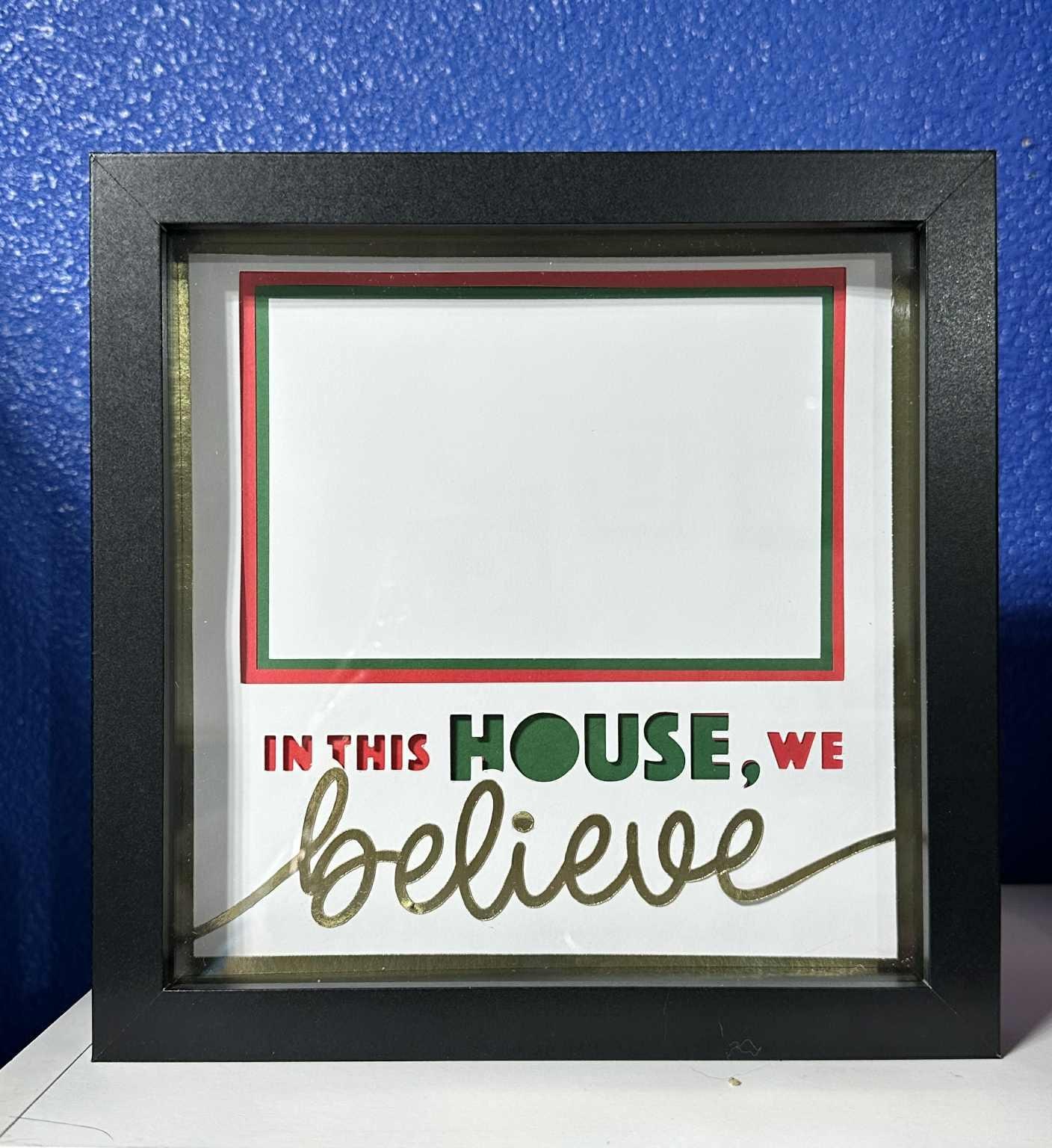 Celebrate the spirit of the season with this handcrafted shadow box featuring the heartfelt phrase “In this house we believe.” Carefully papercrafted and displayed in a sleek black frame, this piece brings warmth and inspiration to any space. Perfect as a Christmas gift, housewarming present, or meaningful addition to your holiday décor, it’s a reminder of faith, love, and family values that make a house a home.