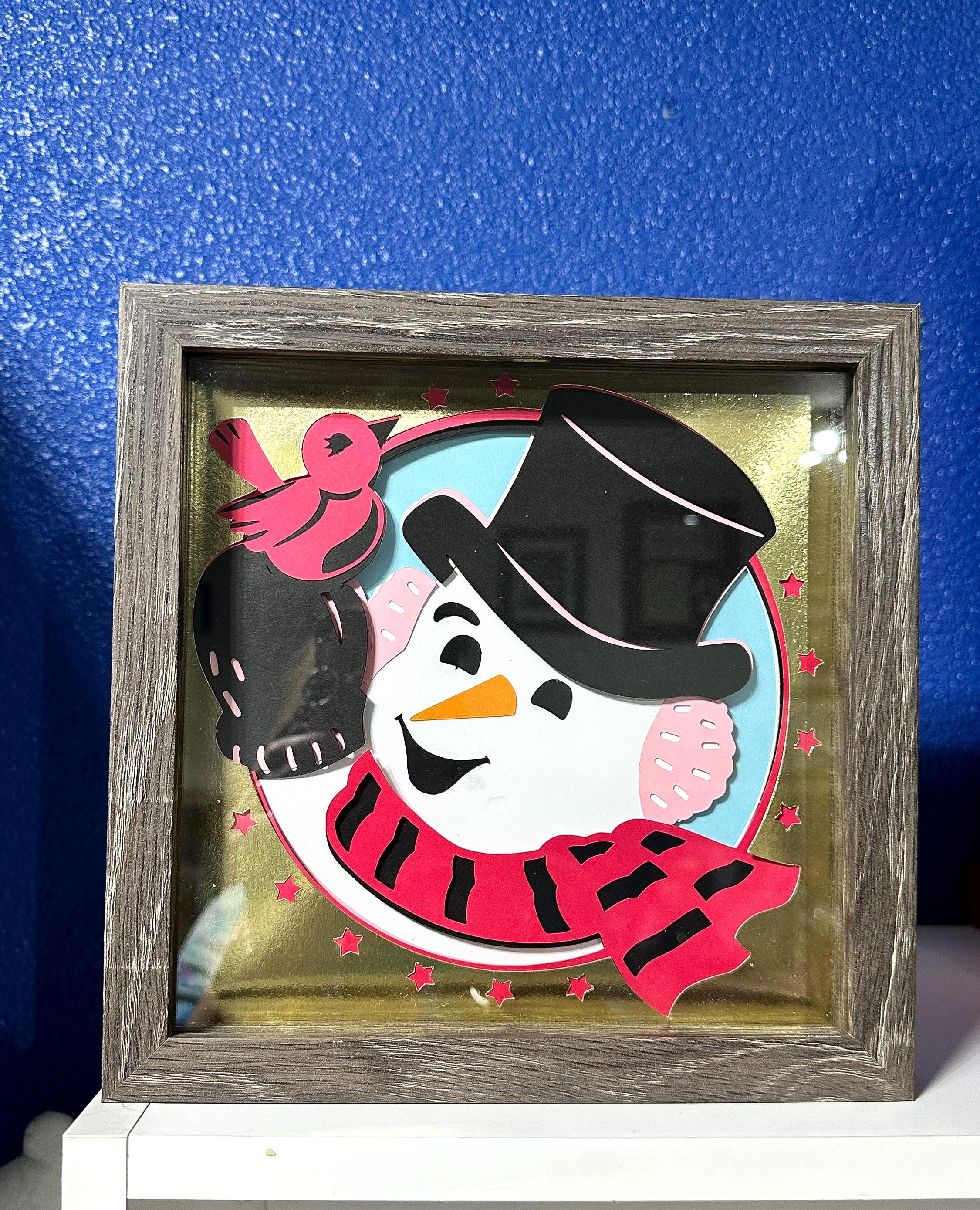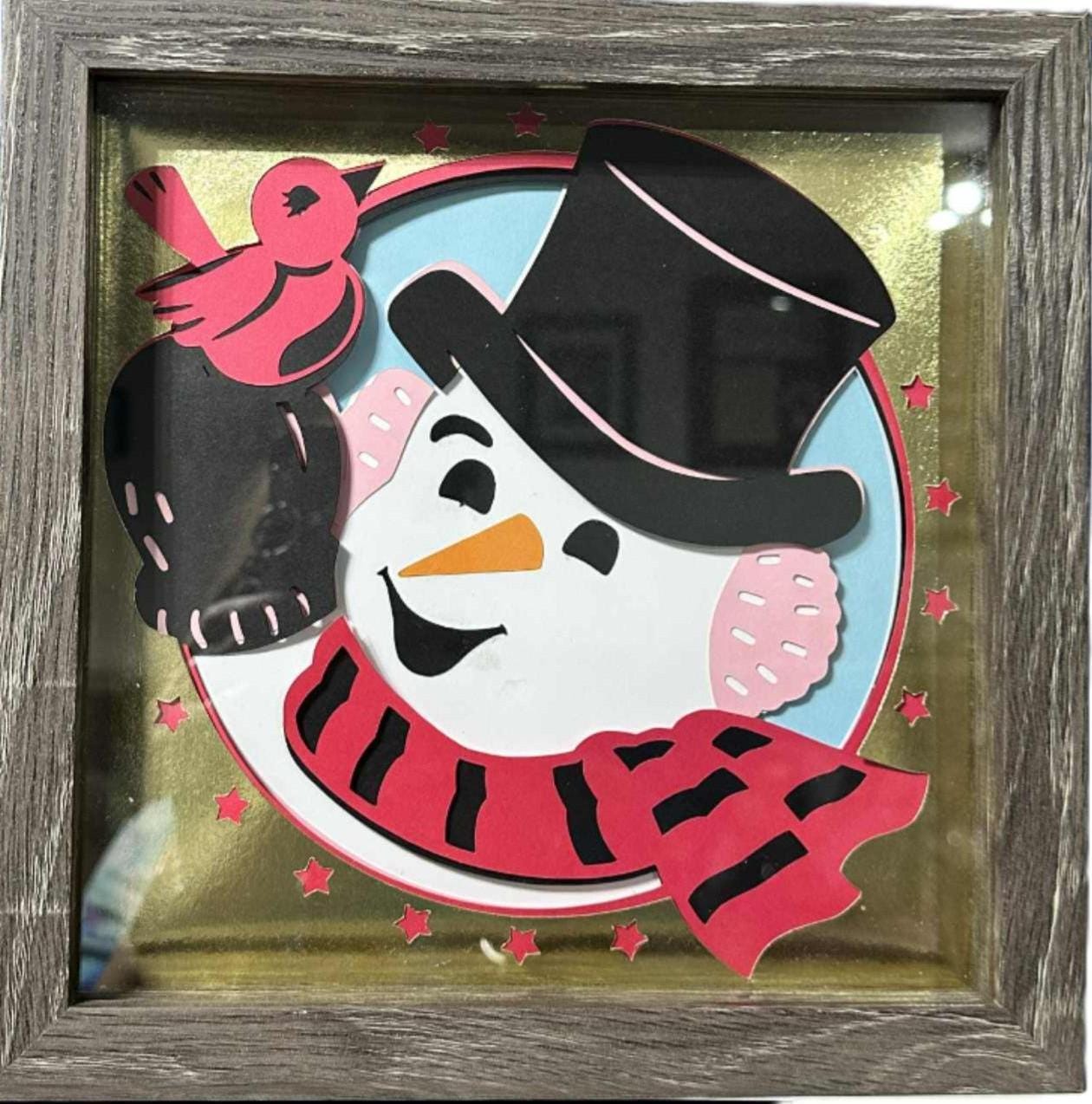This handcrafted retro snowman shadow box will bring nostalgic holiday charm into your home! It features multiple layers of precision-cut paper in a nice grey frame, this design captures the magic of a vintage Christmas. Perfect as a unique Christmas gift, a cozy winter decoration, or a cheerful addition to your seasonal mantle or entryway. With its timeless retro snowman design, this papercrafted item makes a thoughtful keepsake that spreads joy year after year.