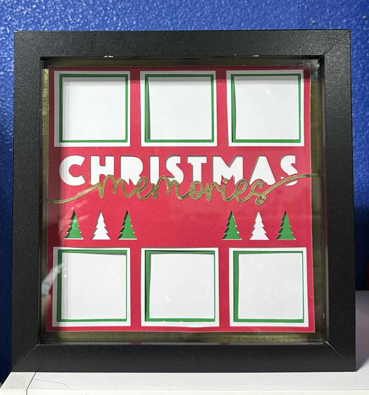 Capture the joy of the season with this handcrafted Christmas Memories shadow box. Featuring a sleek black frame, festive red and green papercrafted design, and the words Christmas Memories in bold lettering, this keepsake is perfect for displaying your favorite holiday photos. The design includes space for multiple pictures, accented with Christmas trees for a classic festive touch. A thoughtful Christmas gift or a beautiful addition to your holiday décor, this shadow box makes it easy to cherish and showcase special family moments year after year.