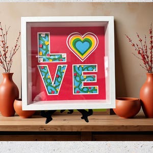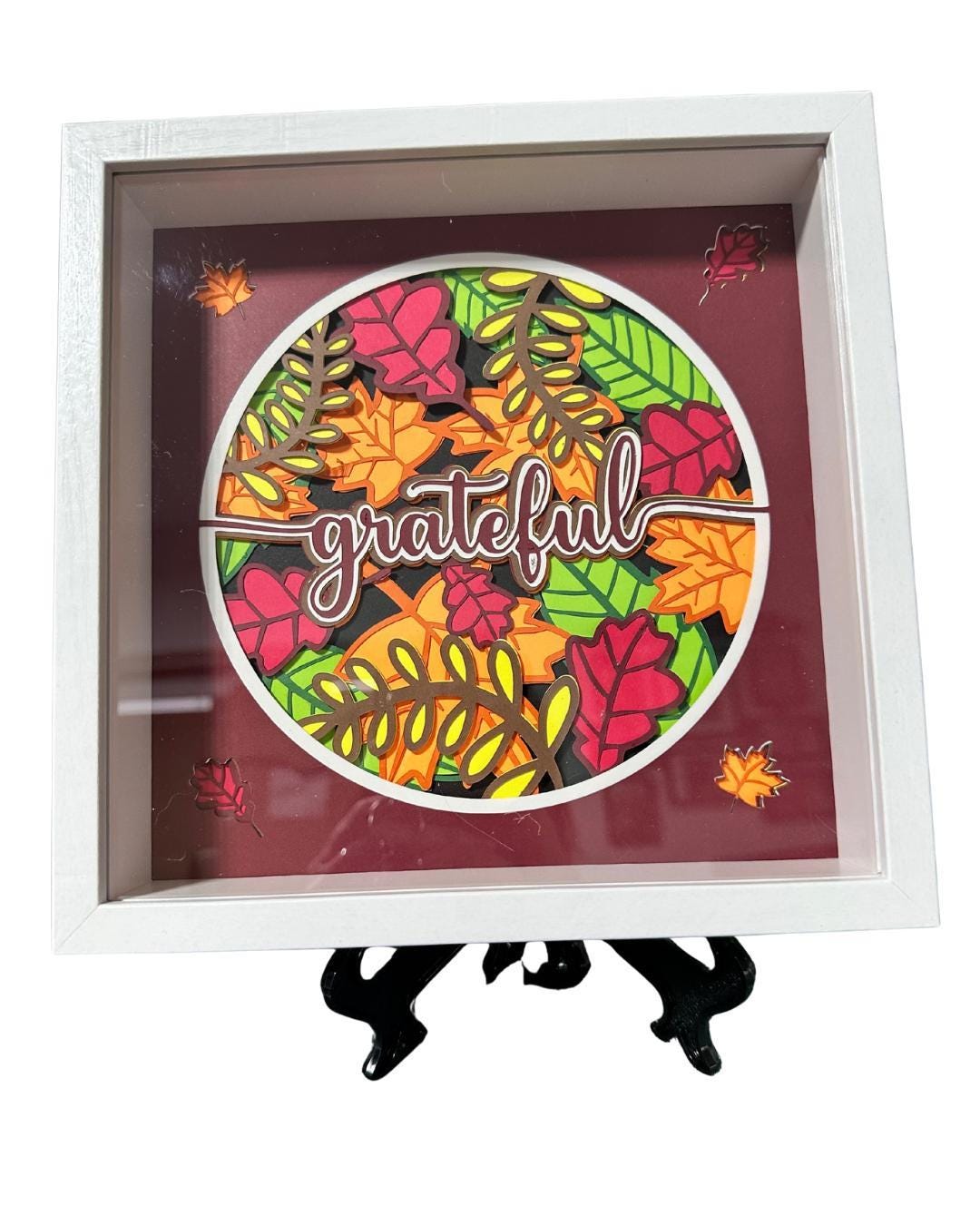 Each layer is carefully cut and arranged in rich fall colors of burnt orange, yellow, rust, and green, creating a deep 3D effect that highlights the word “Grateful” at the center. Framed in a clean white shadowbox, this piece adds the perfect balance of modern simplicity and cozy seasonal charm.