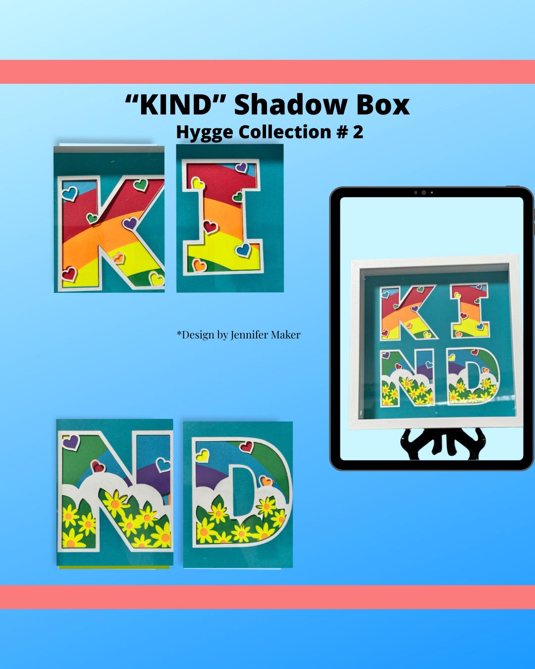 This vibrant artwork features the word KIND built from layered rainbow paper, cheerful florals, and tiny heart details—all arranged within a crisp white shadowbox frame. Each layer is carefully cut and assembled to create depth, color, and a touch of whimsical charm.